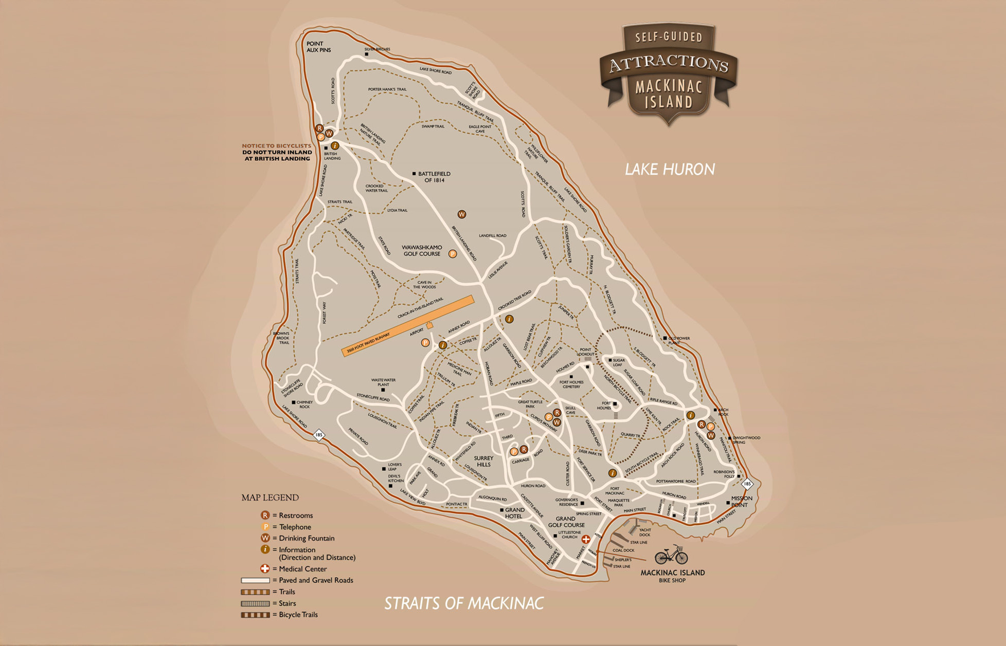 Mackinac Island Bike Shop is your headquarters for great bike rentals for an enjoyable riding experience while on your self-guided attractions tours. These tours are free and appropriate for all ages. If you can ride a bike, you can take the tour and will experience a relaxing pace while riding a top quality bike fitted for your safety, size and comfort.